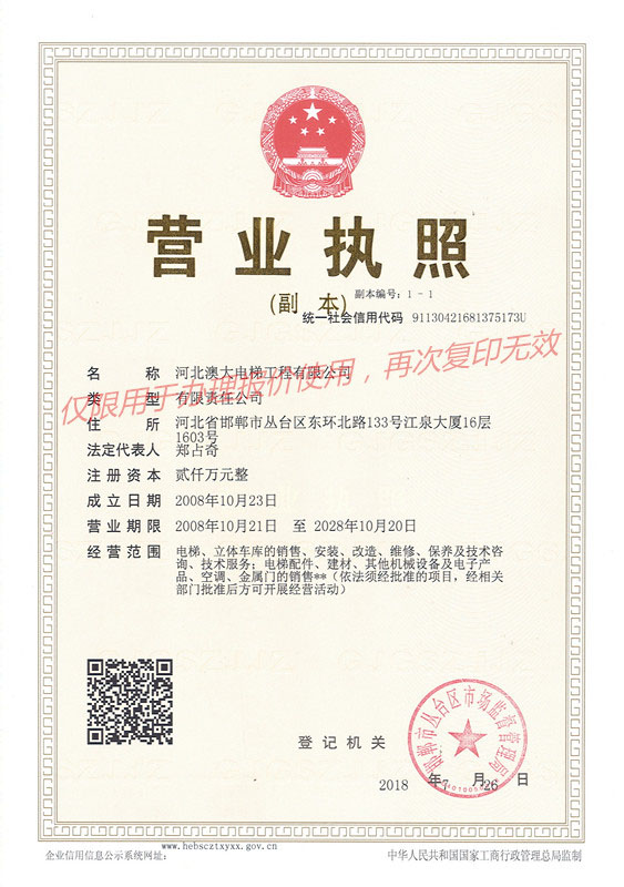 河北澳大電梯工程有限公司是集電梯銷售、安裝、維護保養(yǎng)為一體的專業(yè)化電梯公司。公司具有國家質(zhì)量監(jiān)督檢驗總局頒發(fā)的“電梯安裝改造維修A級”資質(zhì)許可證。下設(shè)市場部、工程部、維保部、技術(shù)部、行政部及電梯配件公司。